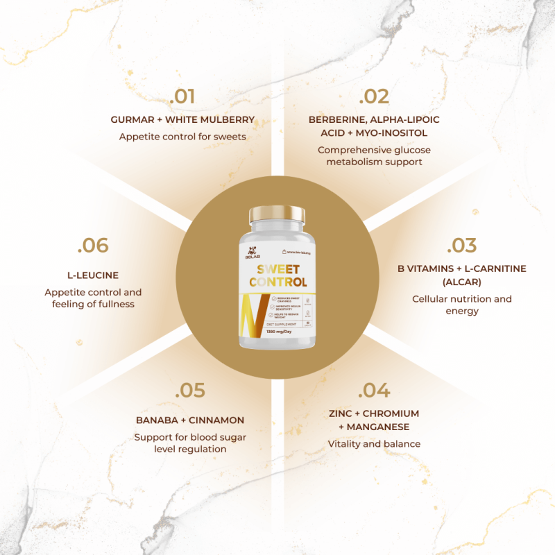 Sweet Control is a women's dietary supplement designed to support daily sweet appetite control, metabolism and overall body balance. The formula combines plant extracts, amino acids and minerals that fit well with conscious supplementation aimed at good form, daily comfort and greater dietary control. It's a support for women who want to more easily maintain their nutritional goals and limit the moments when sweet cravings take over.